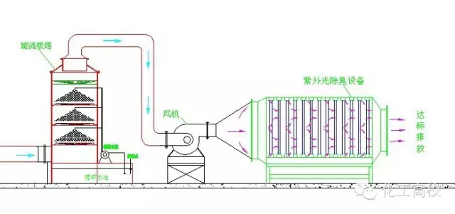 原理:反應(yīng)塔內(nèi)裝填特制的固態(tài)填料,填料內(nèi)部復(fù)配多介質(zhì)催化劑。當(dāng)惡臭氣體在引風(fēng)機(jī)的作用下穿過填料層,與通過特制噴嘴呈發(fā)散霧狀噴出的液相復(fù)配氧化劑在固相填料表面充分接觸,并在多介質(zhì)催化劑的催化作用下,惡臭氣體中的污染因子被充分分解。適用范圍:適用范圍廣,尤其適用于處理大氣量、中高濃度的廢氣,對(duì)疏水性污染物質(zhì)有很好的去除率。優(yōu)點(diǎn):占地小,投資低,運(yùn)行成本低;管理方便,即開即用。缺點(diǎn):耐沖擊負(fù)荷,不易污染物濃度及溫度變化影響,需消耗一定量的藥劑。